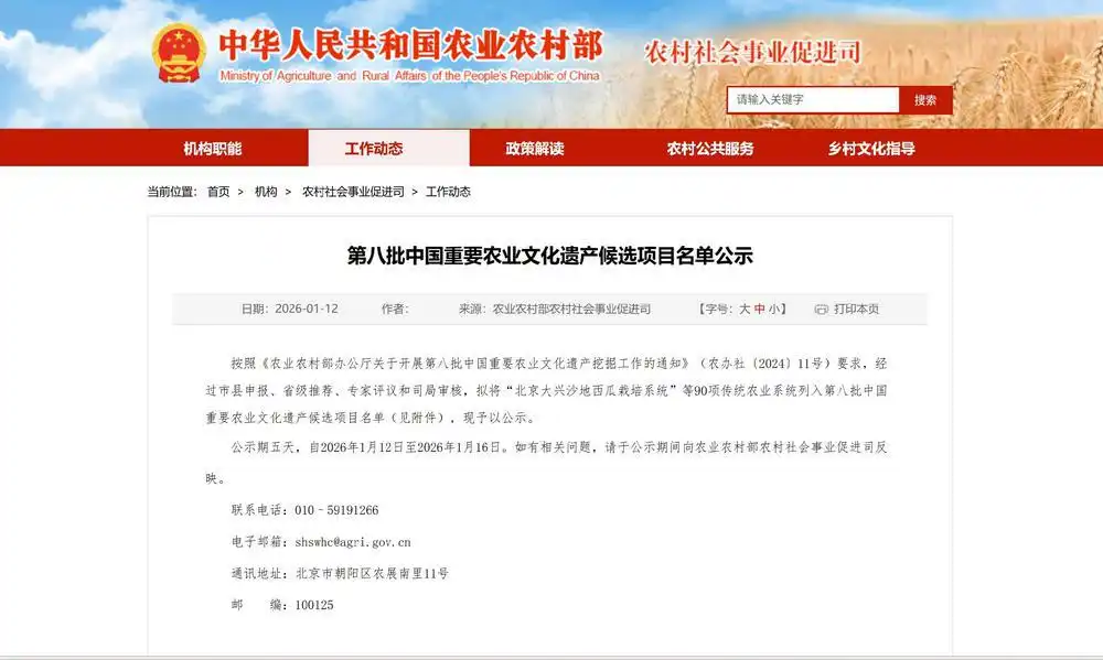 按照1月12日的公告,此次第八批中国重要农业文化遗产挖掘工作,经过市县申报、省级推荐、专家评议和司局审核,公示期五天,自2026年1月12日至2026年1月16日。